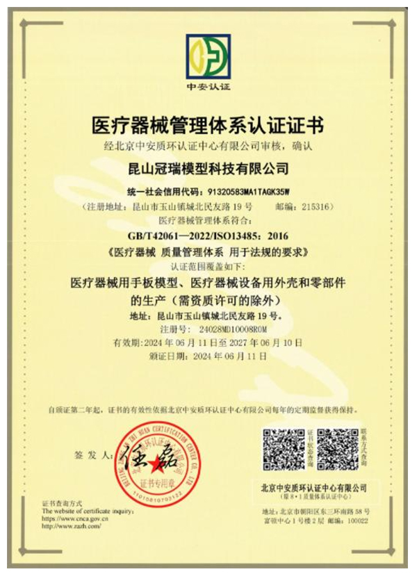 冠瑞成立于2010年, 是一家手板模型及精密零件加工组装的连锁企业。总公司位于江苏省昆山市城北高科园城北大道699号, 自有厂房4000平方,配备人员60余人。业从事手板模型、3D打印快速成型、工业样机及小批量加工生产组装一站式服务企业。服务于生物医疗、医疗器械、人工智能、机器人、家用电器、通讯 、办公设备、汽摩交通、安防、航天军工、仿真模型、玩具、礼品等行业,致力于向客户提供新产品设计阶段的验证、试制及塑胶件金属产品小批量生产的解决方案, 为客户缩短试制周期及节约开发成本及快速小批量生产组装。